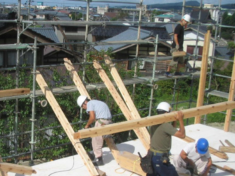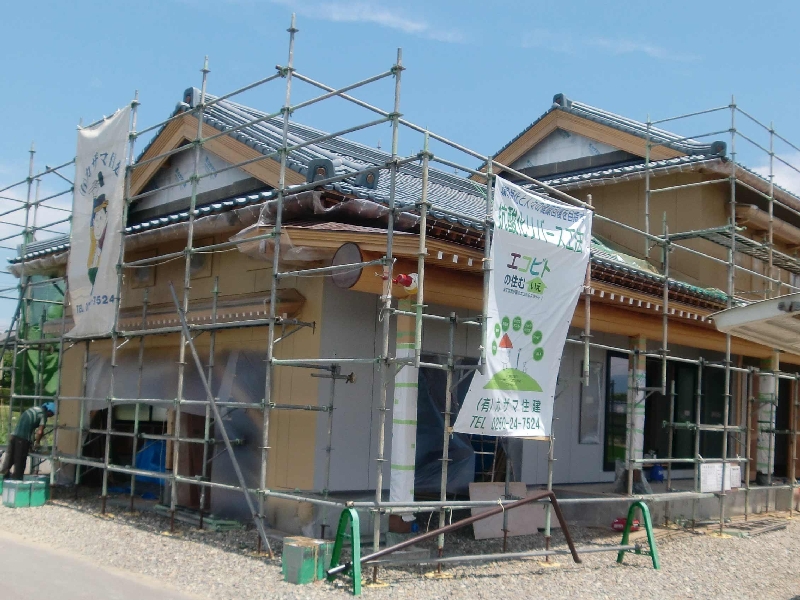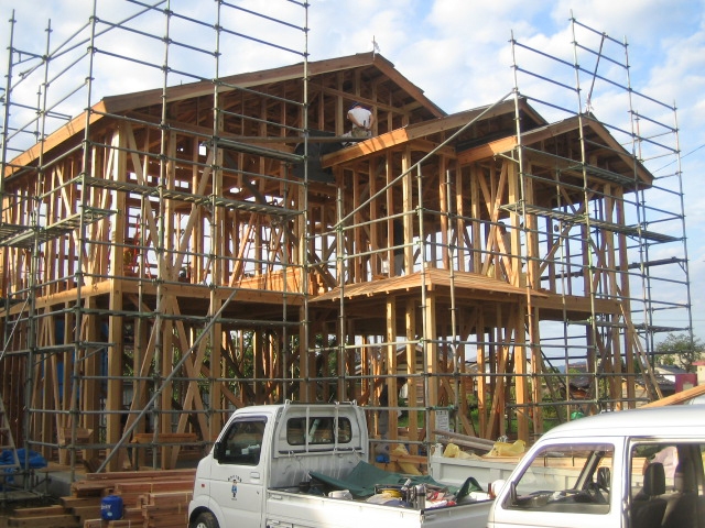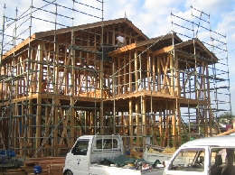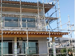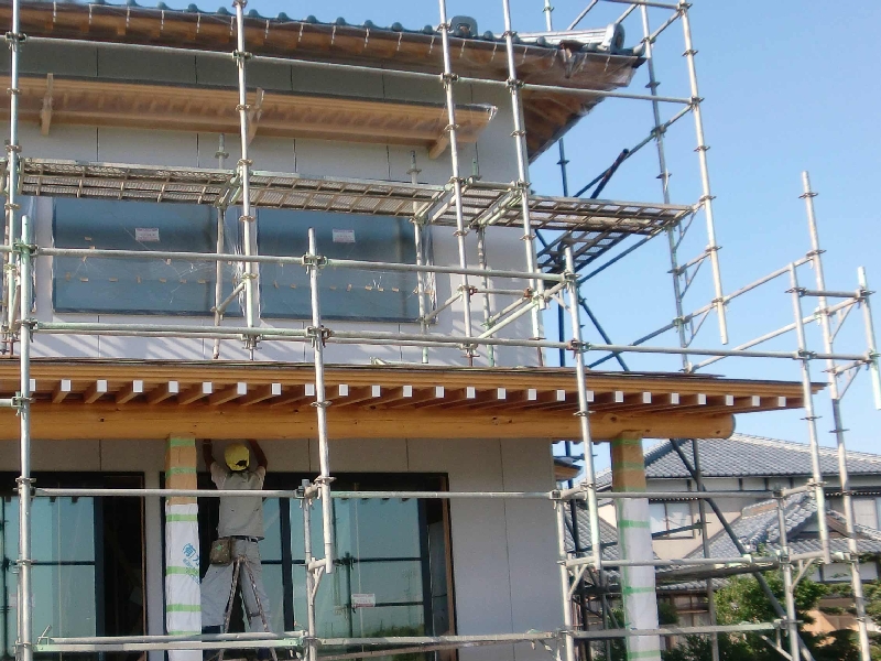 足場も安全対策上また、作業性を考えると重要です。サッシの取り付け、破風や軒天の施工で作業しやすい高さにあると効率がグンと上がります。